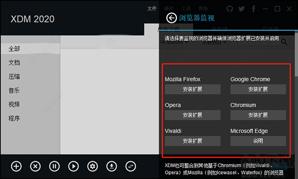 2、可以支持各大主流瀏覽器,如:谷歌瀏覽器,火狐瀏覽器,Opera,Edge,需要在瀏覽器監(jiān)視里面安裝擴(kuò)展支持,這樣就可以嗅探網(wǎng)頁里的下載地址了;