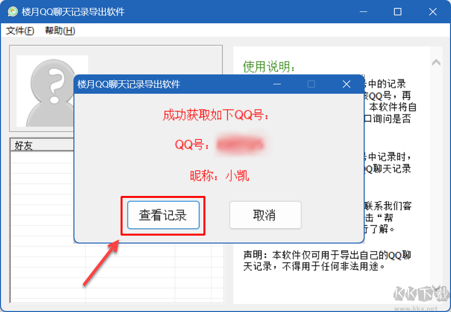 2,電腦版QQ不要退出登錄,運(yùn)行樓月QQ聊天記錄導(dǎo)出軟件,單擊彈出對話框上的“查看記錄”按鈕。