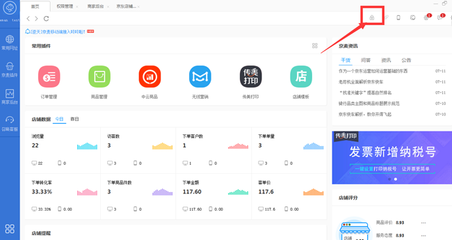 a.打開(kāi)PC客戶端后點(diǎn)擊右上角的鎖形圖標(biāo)“權(quán)限管理”。注:同一子賬號(hào)京麥權(quán)限與商家后臺(tái)權(quán)限需分開(kāi)設(shè)置,僅有主賬號(hào)可設(shè)置權(quán)限。
