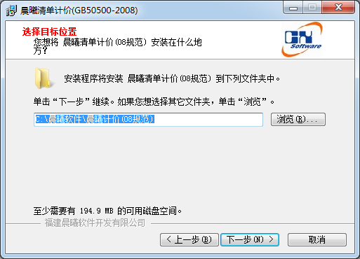 安裝程序?qū)惭b晨曦清單計(jì)價(08規(guī)范)到下列文件夾中。單擊“下一步”繼續(xù)。如果您想選擇其它文件夾,單擊“瀏覽”。