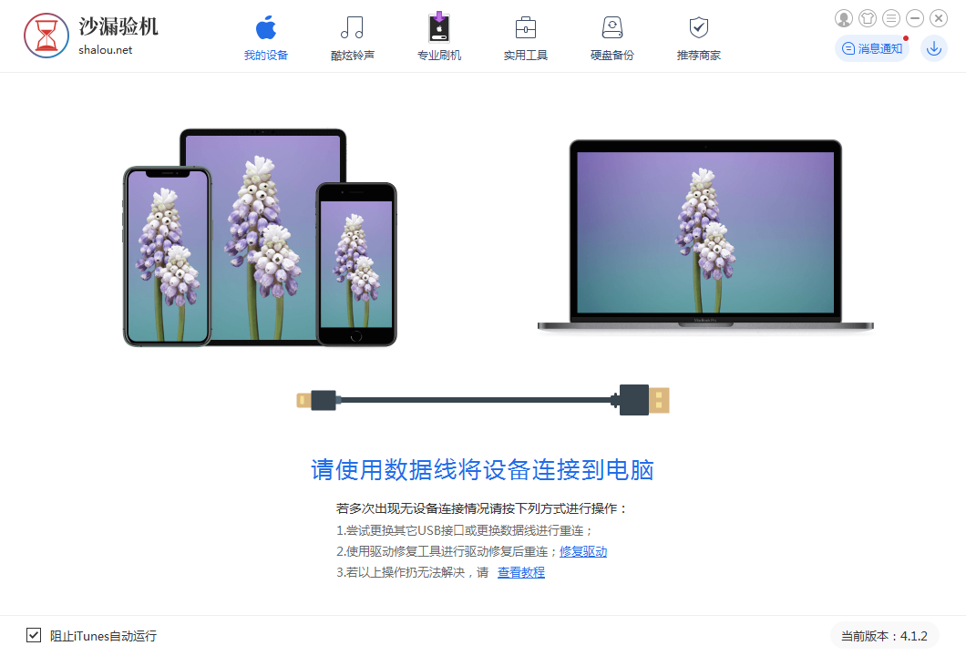 1.打開沙漏驗機助手,要用數(shù)據(jù)線將你的手機連到電腦