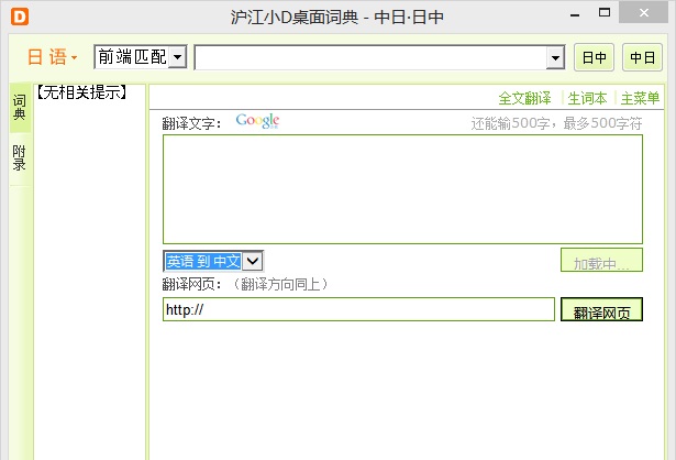 2、在滬江小d日語(yǔ)詞典文字框內(nèi)輸入需要翻譯的文字,選擇翻譯語(yǔ)種,輸入需要翻譯的網(wǎng)頁(yè)網(wǎng)址。
