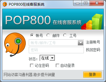 POP800在線客服系統(tǒng)是針對企業(yè)網(wǎng)站提供的訪客服務系統(tǒng),它具有實時聊天、流量統(tǒng)計、客戶管理等眾多功能,在有客戶訪問你網(wǎng)站時第一時間進行溝通,從而促成成交或進行后續(xù)服務!是網(wǎng)絡營銷提供銷量非常好用的軟件!同時也讓你的網(wǎng)站更具有粘性。