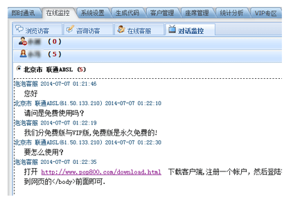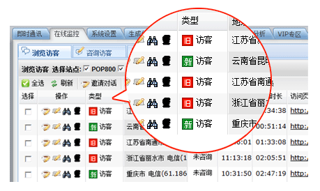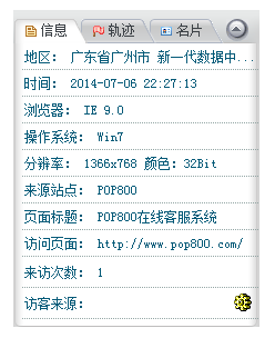 客戶服務可以監(jiān)控訪問者的IP、區(qū)域、來源頁面、關鍵字、訪問時間、在線時間、訪問頁面、訪問次數(shù)和瀏覽頁面,全面實時地控制客戶信息。