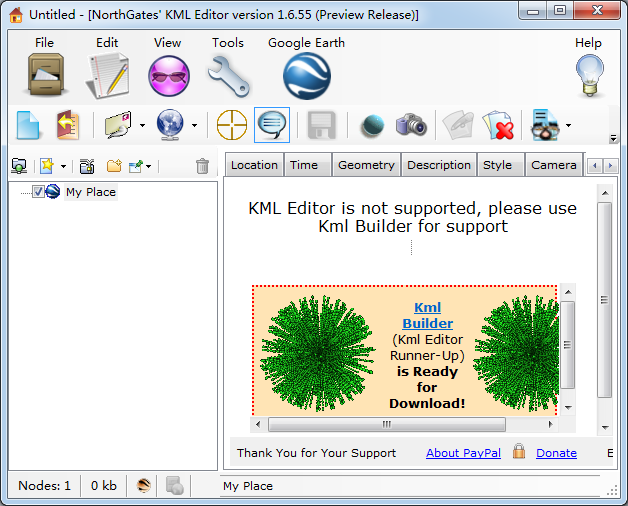 KMLEditor是一款專(zhuān)門(mén)為KML文件提供的編輯器,KML文件是谷歌公司創(chuàng)建的一種地標(biāo)性文件。用于記錄某一地點(diǎn)、或連續(xù)地點(diǎn)的時(shí)間、經(jīng)度、緯度、海拔等地理信息數(shù)據(jù),供GE等有關(guān)軟件使用,你可以通過(guò)KMLEdito更簡(jiǎn)單的修改KML文件~歡迎下載使用~