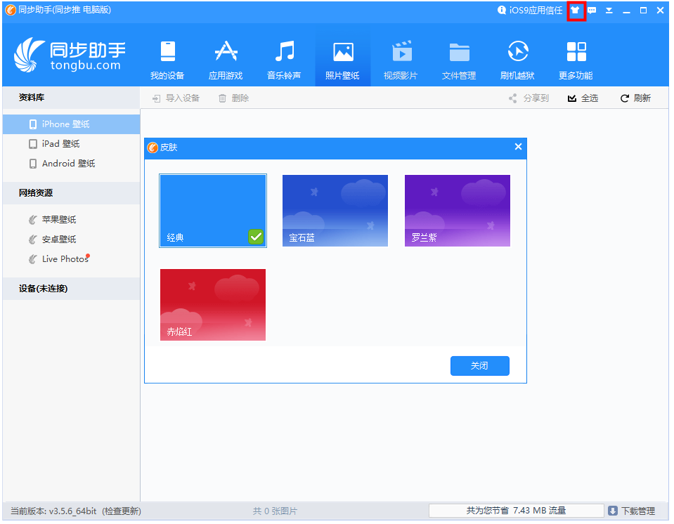 打開同步助手,進(jìn)入界面,點(diǎn)擊上方的換膚圖標(biāo),自行設(shè)置軟件界面皮膚;