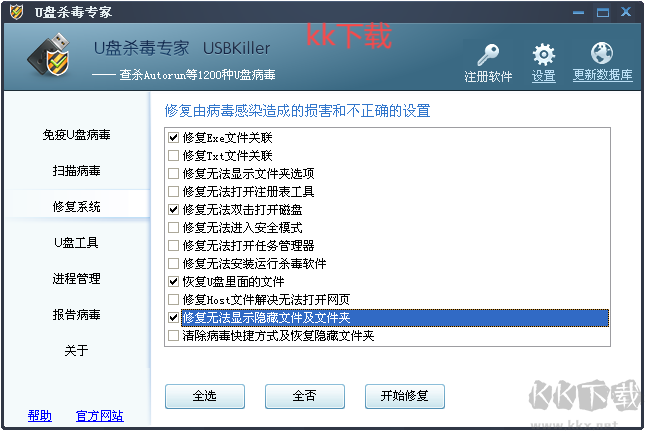 3.選擇 “修復(fù)系統(tǒng)”,于面板中選取如下所示的幾個(gè)選項(xiàng)(也可全選),隨后點(diǎn)擊 “開始修復(fù)”,此操作將恢復(fù)因文件夾 EXE 病毒而受損的文件夾相關(guān)問(wèn)題 。
