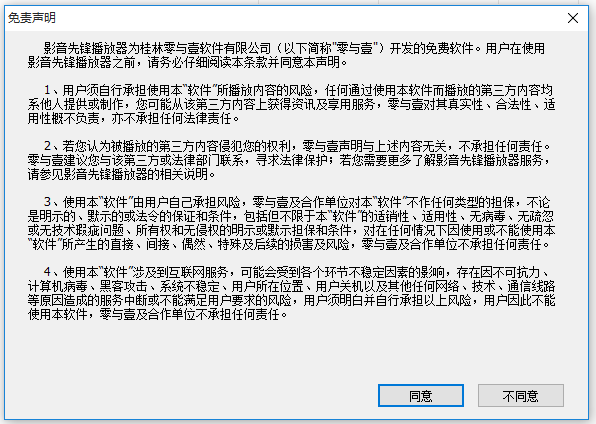 影音先鋒播放器為桂林零與壹軟件有限公司( 以下簡(jiǎn)稱(chēng)"零與壹”)開(kāi)發(fā)的免費(fèi)軟件。用戶在使用影音先鋒播放器之前,請(qǐng)務(wù)必仔細(xì)閱讀本條款并同意本聲明。