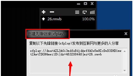 2、點(diǎn)擊創(chuàng)建先鋒鏈接(xfplay),會(huì)出現(xiàn)一個(gè)影音先鋒的視頻地址,你可以把地址復(fù)制發(fā)給對(duì)方,進(jìn)行下載點(diǎn)播,