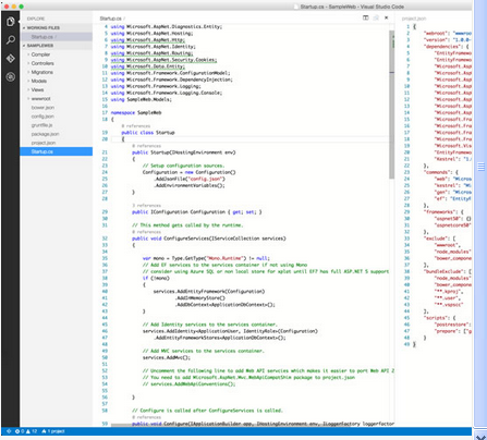 作為 ASP.NET 5 的開發(fā)工具,VS Code 已經(jīng)是一個富編輯器,它內(nèi)置具備很多日常功能。簡單使用有效的 Yeoman 工具產(chǎn)生你的 ASP.NET 5 web 應(yīng)用框架,并指向其根目錄。你找到了一個功能豐富的 IDE(示例項目截圖),它的 Omnisharp-powered 為代碼提供了智能感知,錯誤,命令,部署和集成版本控制功能。所有的這些設(shè)計可以保持現(xiàn)代,精益,跨平臺的 ASP.NET 5 web 開發(fā)在 VS Code 上的所需。