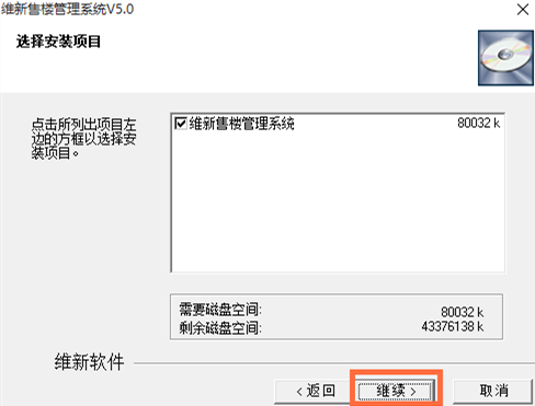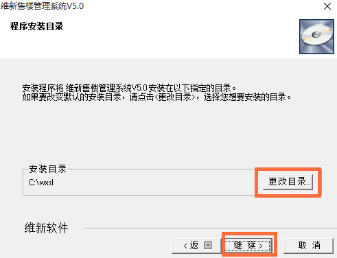 選擇軟件安裝路徑,點(diǎn)擊【繼續(xù)】,安裝程序?qū)⒕S新售樓管理系統(tǒng)V5.0安裝在以下指定的目錄。