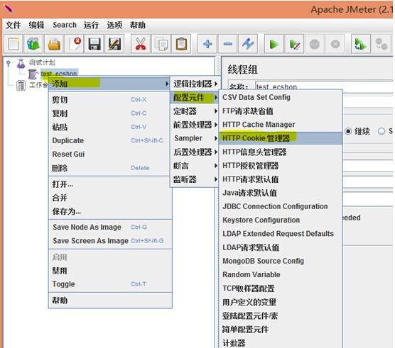 添加一個Cookie管理器,該次測試是需要登陸操作,如果沒有Cookie管理器,登陸后的HTTP請求,在腳本運行的時候,就不會帶Cookie。應該知道后果吧,就是登陸成功后的請求提示你未登陸。添加就行不需要配置。