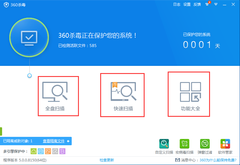1、在本站下載安裝好360殺毒軟件后打開軟件,軟件主界面有全盤掃描、快速掃描、功能大全三個選項,在界面右下角也有自定義掃描、宏病毒掃描、等特色功能。