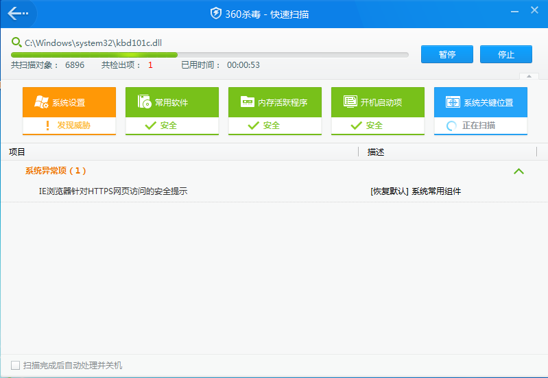 3、點擊快速掃描后,360殺毒將會對系統(tǒng)設(shè)置、常用軟件、內(nèi)存活躍程序等位置進行掃描,稍等片刻,異常將會在下方展示出來,掃描結(jié)束后可選擇立即處理,這些問題就會被修復(fù)成功。