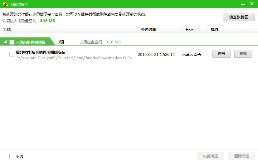 在隔離內(nèi)容中找到您需要恢復(fù)的文件,選中點擊右下角的“恢復(fù)所選”,被隔離的文件將恢復(fù)到原來保存的路徑中,你也可以自定義路徑。