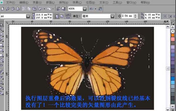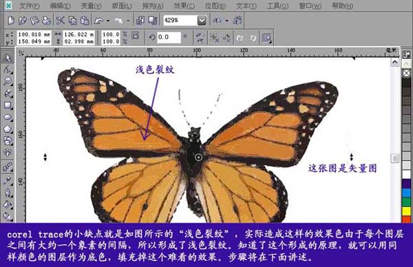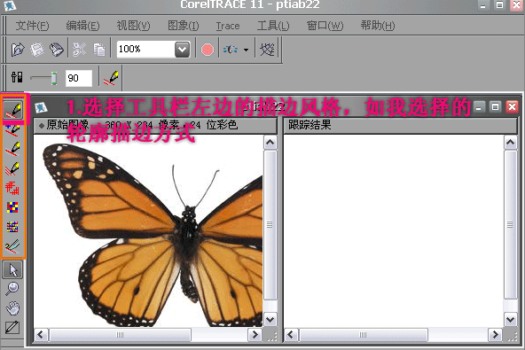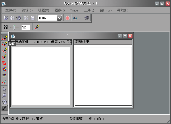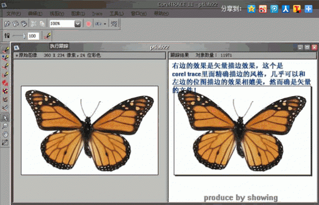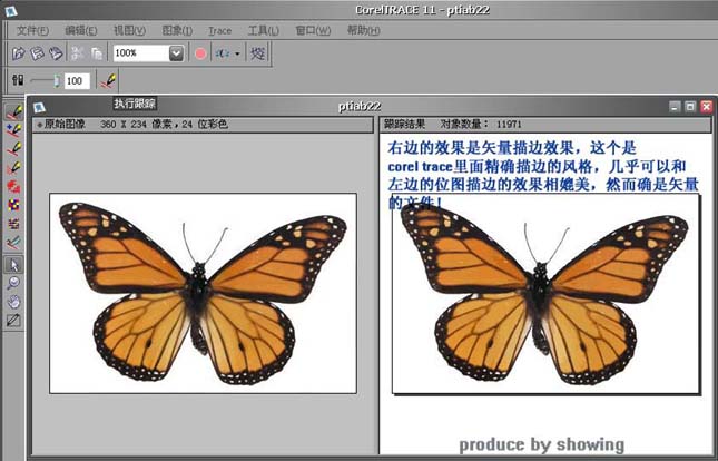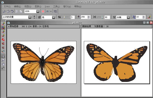 CorelTRACE軟件的界面,左圖為位圖的原始圖,右圖為矢量化以后的矢量圖;