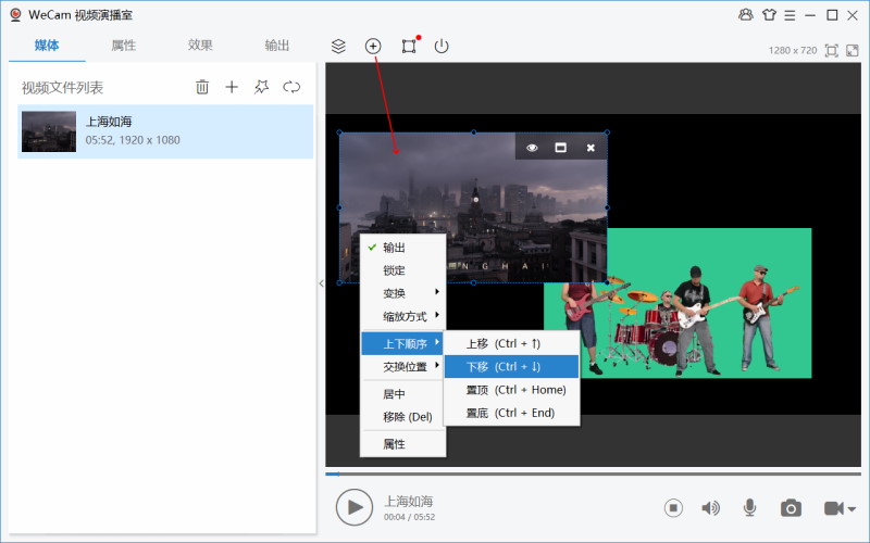 你可以通過(guò)右鍵菜單或快捷鍵調(diào)整兩個(gè)視頻對(duì)象的上下順序,如下圖所示,把背景視頻移到綠幕視頻下方: