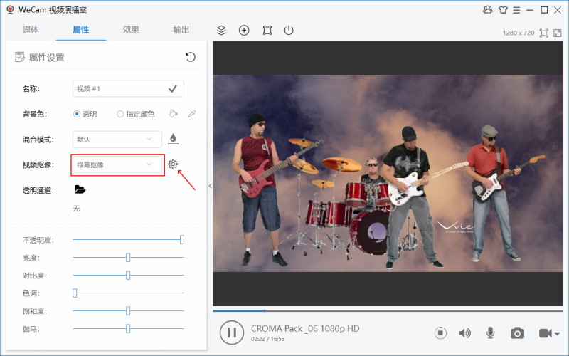 4.選中綠幕視頻對(duì)象(視頻#1)后,進(jìn)入 屬性 設(shè)置面板,視頻摳像 選擇 綠幕摳像 即可: