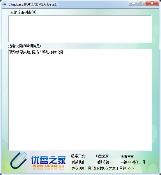 2、打開后可以看到顯示獲取信息失敗,因?yàn)樾【幍腢盤并沒有插到電腦上,此時(shí)小編將U盤插入電腦,在u盤芯片檢測工具(ChipEasy)軟件界面就會顯示出U盤的纖細(xì)信息了!
