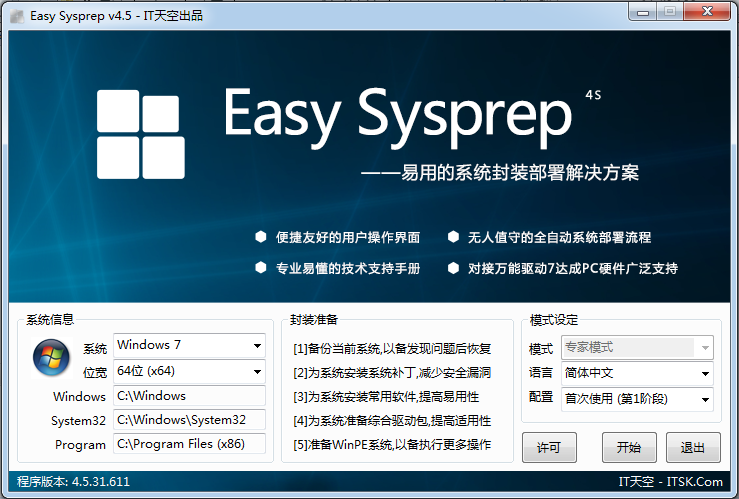 Easy Sysprep是IT天空打造的一款強(qiáng)大的系統(tǒng)封裝工具,它與萬(wàn)能驅(qū)動(dòng)助理結(jié)合后所得到的整套的系統(tǒng)部署解決方案,可以有效的將系統(tǒng)安裝流程化繁為簡(jiǎn),降低技術(shù)成本,是系統(tǒng)封裝人員以及系統(tǒng)技術(shù)愛(ài)好者的必備系統(tǒng)封裝工具。