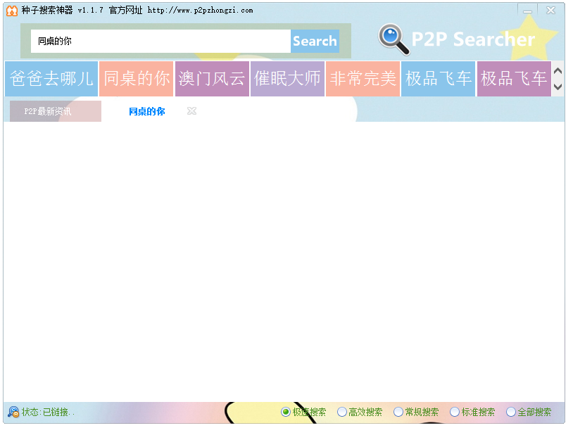P2P searcher是一款種子資源搜索工具,可以支持極速搜索、高效搜搜、常規(guī)搜索、標(biāo)準(zhǔn)搜索、全部搜索等多選搜索方案的一款BT種子搜搜神器,幫助我們下載影視大片,音樂包,小說,圖片等各種資源!
