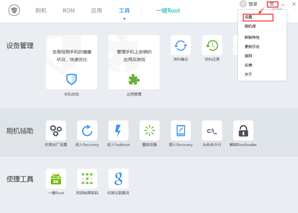打開刷機(jī)精靈軟件,點(diǎn)擊右上角的更多按鈕,選擇【設(shè)置】。