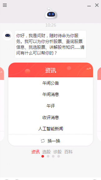 Hi.我是“問(wèn)財(cái)”。同花順發(fā)布的全國(guó)首款智能投資助手,你與我交流的越多,就越能高效的幫你解決投資問(wèn)題。請(qǐng)點(diǎn)擊安裝~