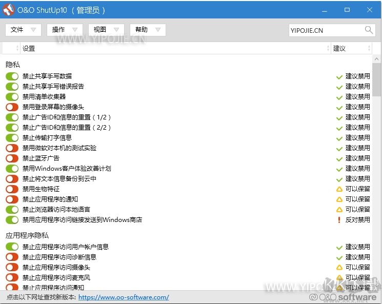 O&O ShutUp10是針對Win10系統(tǒng)而開發(fā)的一款隱私設(shè)置工具,由于微軟大量運用了收集用戶數(shù)據(jù)的操作來完善自身,不可避免的會導(dǎo)致用戶隱私泄漏,如果你對隱私比較敏感,同時又不知道如何對Win10進(jìn)行隱私設(shè)置,那么O&O ShutUp10 這款軟件非常適合你,它使用簡單,隱私項目一目了然!