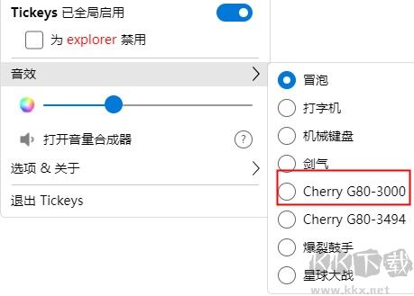 Tickeys官網(wǎng)版自帶四種音效,比如打字機(jī)的噠噠聲、冒泡的咕嚕聲、機(jī)械鍵盤的咔嗒聲,還有新增的爆裂鼓手模式,敲鍵盤像打鼓一樣帶感。軟件還專門給Cherry的G80 3000和3494兩款鍵盤配了專屬音效。不同按鍵聲音不一樣,回車、退格、空格這些鍵音效更特別,連續(xù)敲不會(huì)覺得單調(diào)。每個(gè)音效的音調(diào)、音量都能自己調(diào),想安靜點(diǎn)或大聲點(diǎn)都行。平時(shí)打字聽膩了普通聲音,用它換個(gè)音效,碼字都變有意思了,感興趣或者有需要的小伙伴就快來kk網(wǎng)站下載體驗(yàn)一下吧。