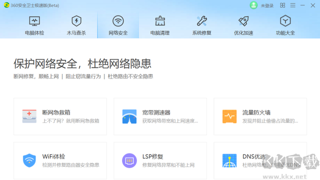 除已有功能外,360安全衛(wèi)士極速版還額外提供了“網(wǎng)絡安全”系列新功能。