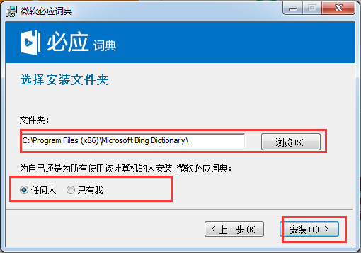 3.你可以默認(rèn)軟件安裝位置(C: IProgram Files (x86)VMicrosoft Bing Dictionary\)也可以點(diǎn)擊瀏覽選擇安裝位置;