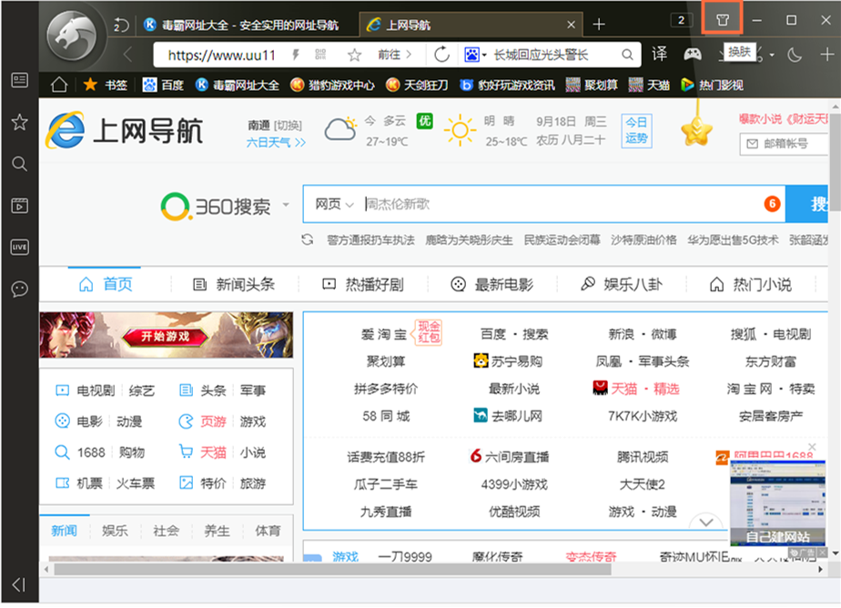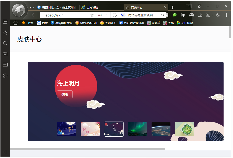 打開(kāi)獵豹安全瀏覽器,進(jìn)入界面,點(diǎn)擊右上方的【換膚】按鈕,
