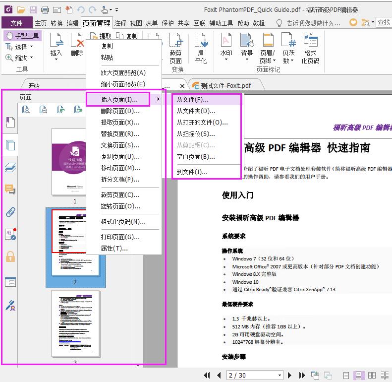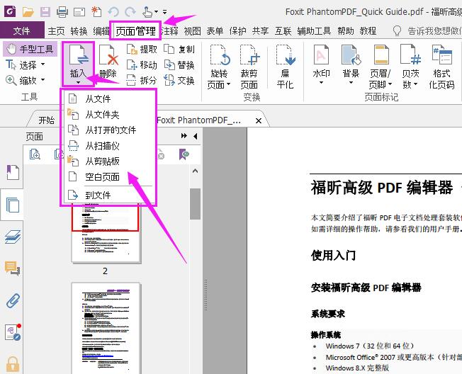 點擊頁面管理>插入,在列出的選項中選擇合適的一種進行文檔合并