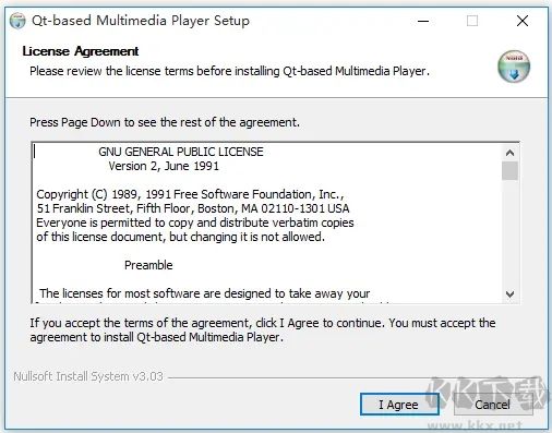 1、下載 Qmmp 壓縮包并解壓,雙擊.exe 文件啟動安裝程序,閱讀協(xié)議后點擊【I Agree】。