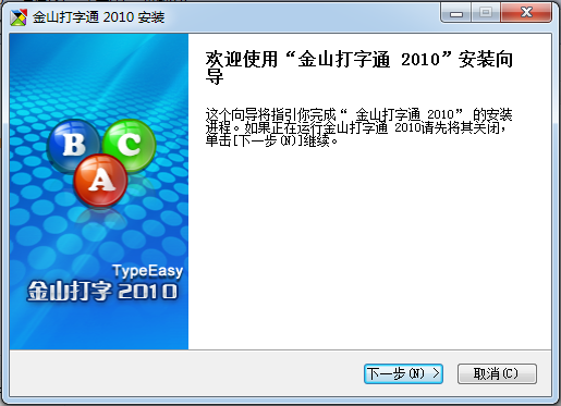 1.這個向?qū)⒅敢阃瓿?ldquo;金山打字通2010”的安裝如果正在運行金山打?qū)W通2010請先將其關(guān)閉,單擊[下一步0叮]繼續(xù)。