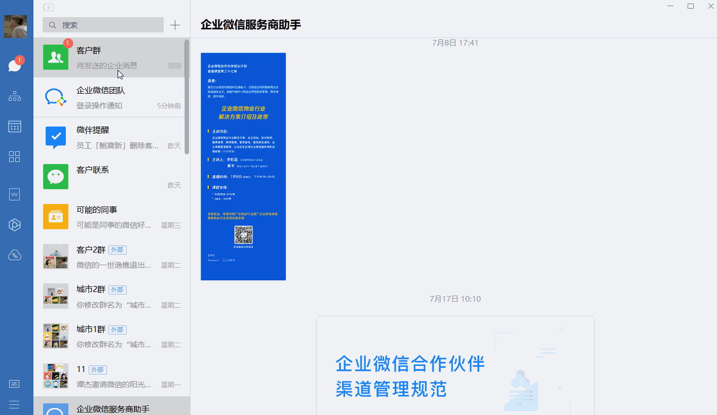 7、會話存檔:企業(yè)可在微伴助手上開通企業(yè)微信會話存檔功能,在員工和客戶知情的前提下,將客戶與員工之間的聊天記錄保存下來,用于內(nèi)部自查風險,員工有無敏感行為操作,例如濫用企業(yè)資源、過度承諾、辱罵客戶等情況出現(xiàn),如若出現(xiàn),可及時糾正。