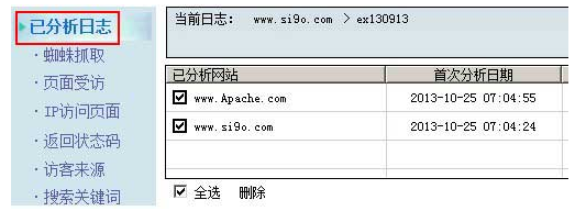 1、單擊“已分析日志”,如果已經(jīng)分析了兩個以上的網(wǎng)站,會顯示它們的域名,單擊“全選”選中它們,如圖所示: