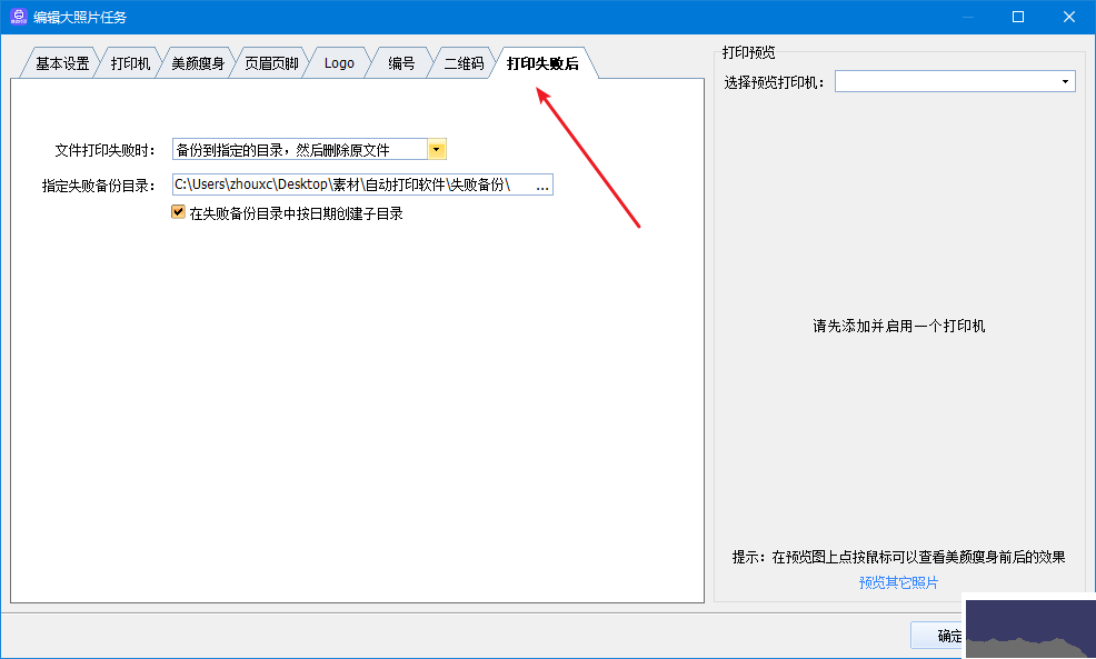 2.將 “文件打印失敗時” 設(shè)置為 “備份到指定的目錄,然后刪除源文件”,選擇保存失敗照片的文件夾。