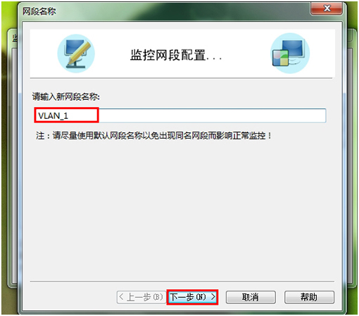 3、輸入新網(wǎng)段的名稱,比如VLAN_1,點擊下一步按鈕,彈出下面窗口。