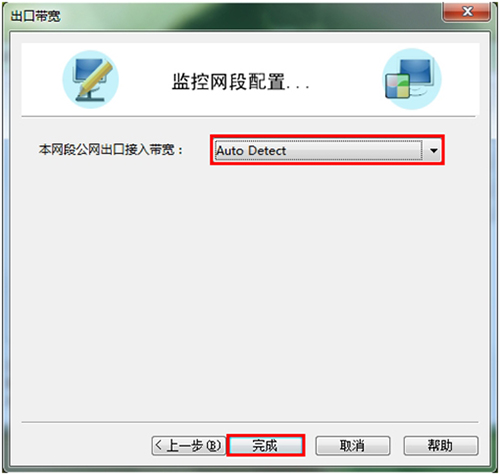 6、在下面彈出的窗口中,選擇本網(wǎng)段公網(wǎng)出口接入帶寬為:Auto Detect也就是默認(rèn)的選項就行,也就是自動檢測公網(wǎng)出口是什么樣的接入寬帶,點擊完成按鈕,到此為止需要創(chuàng)建的監(jiān)控網(wǎng)段就創(chuàng)建好了。