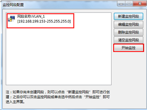從上面的窗口中可以看到的信息是,監(jiān)控網(wǎng)段的名稱:VLAN_1 本機IP:192.168.199.153 子網(wǎng)掩碼:255.255.255.0,這個時候配置好需要監(jiān)控的網(wǎng)段后,點擊“開始監(jiān)控”按鈕,彈出下面窗口:
