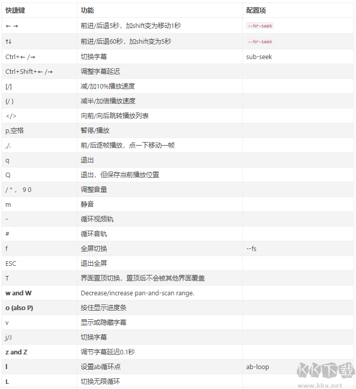 操作主要依賴鍵盤快捷鍵(區(qū)分大小寫),常用如空格控制播放 / 暫停,Q 鍵停止播放,方向鍵調(diào)整進(jìn)度。