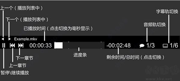 MPV 通過 OSC 界面提供基礎(chǔ)控制,播放時(shí)移動(dòng)鼠標(biāo)即可顯示進(jìn)度條、音量等操作按鈕。