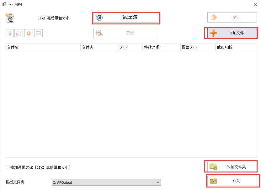 2、這里以MP4選為例,先點(diǎn)擊添加文件或者添加文件夾選項,添加需要轉(zhuǎn)換的格式文件;接著設(shè)置輸出配置選項,設(shè)置好文件的類型、大小、品質(zhì)等選項,點(diǎn)擊【改變】按鈕,選擇合適的輸出位置,設(shè)置完成后我們就可以點(diǎn)擊界面上方的確定選項,等待處理完成就可以在設(shè)置的保存位置找到所需的文件了。