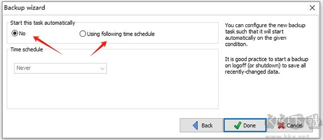 6、設(shè)置自動(dòng)備份功能,選 NO 為手動(dòng)備份,選 Using following time schedule 可設(shè)自動(dòng)計(jì)劃。
