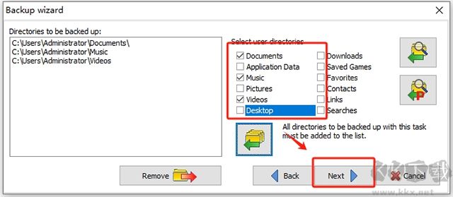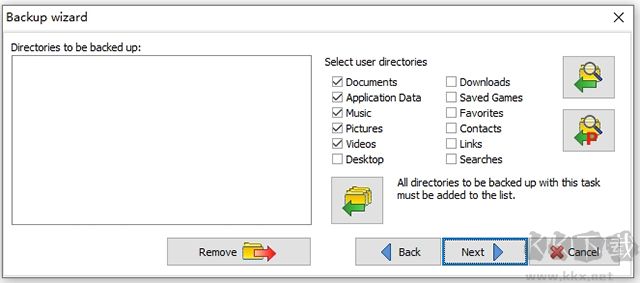 3、選擇需備份的目錄,在右側(cè)選中對(duì)應(yīng)數(shù)據(jù)添加到左側(cè),也可手動(dòng)添加文件夾。