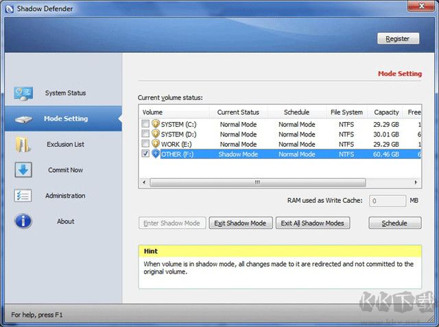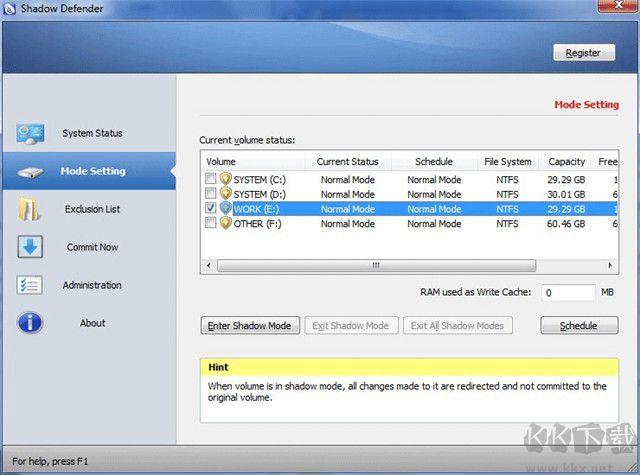 軟件可以使用RAM作為寫(xiě)緩存。啟用寫(xiě)緩存時(shí),shadow defender將所有更改寫(xiě)入該高速緩存。這將提高磁盤(pán)訪問(wèn)速度。當(dāng)寫(xiě)緩存耗盡時(shí),所有的寫(xiě)操作都將無(wú)縫地重定向到磁盤(pán)。