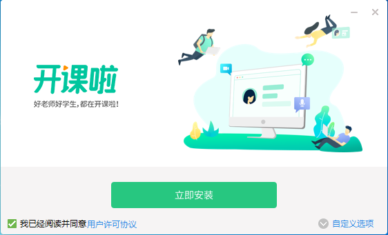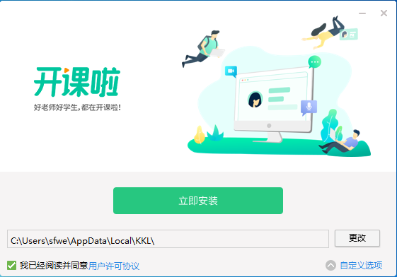 1.到本站下載安裝開(kāi)課啦直播,打開(kāi)安裝程序,點(diǎn)擊自定義選項(xiàng),開(kāi)始立即安裝