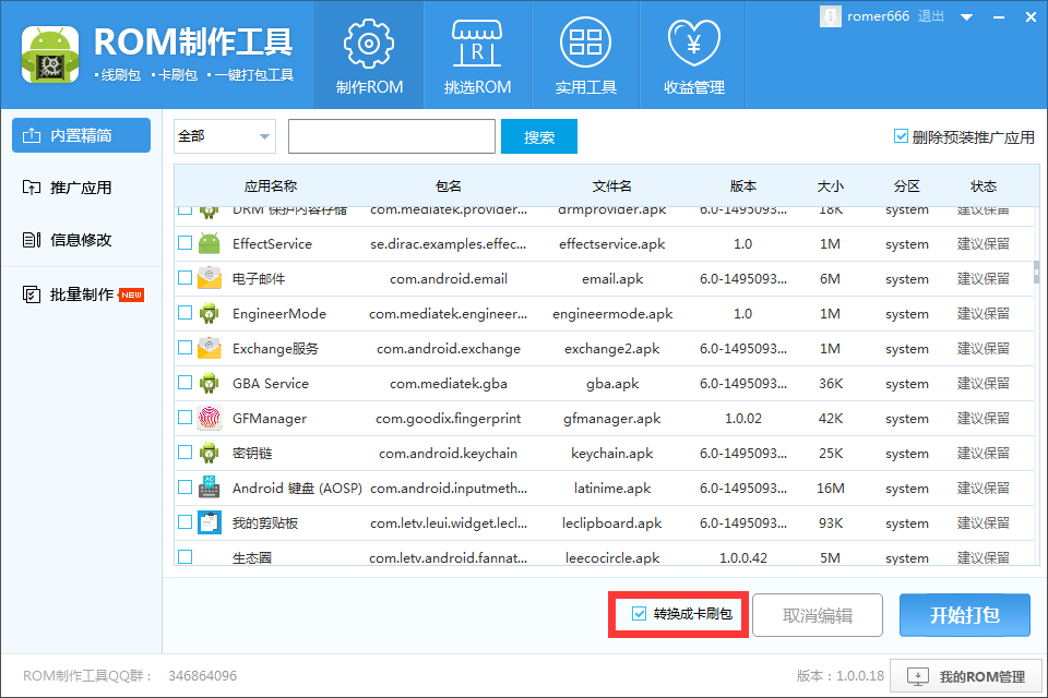 4、勾選好之后選擇【開始打包】即可轉(zhuǎn)換成卡刷包,轉(zhuǎn)換的卡刷包可以直接使用第三方recovery刷入。