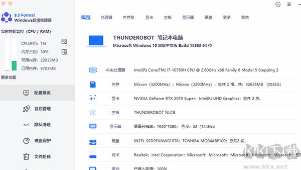 1、打開軟件,首頁展示電腦配置,左上角實時顯示空間占用,直觀清晰。